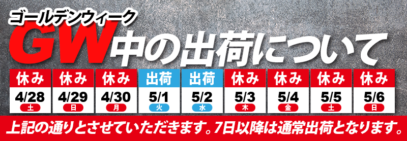 5月1日と2日は通常通り出荷を、それ以降は5月7日 月曜日が発送日となります。7日以降は通常通りの営業を再開します。