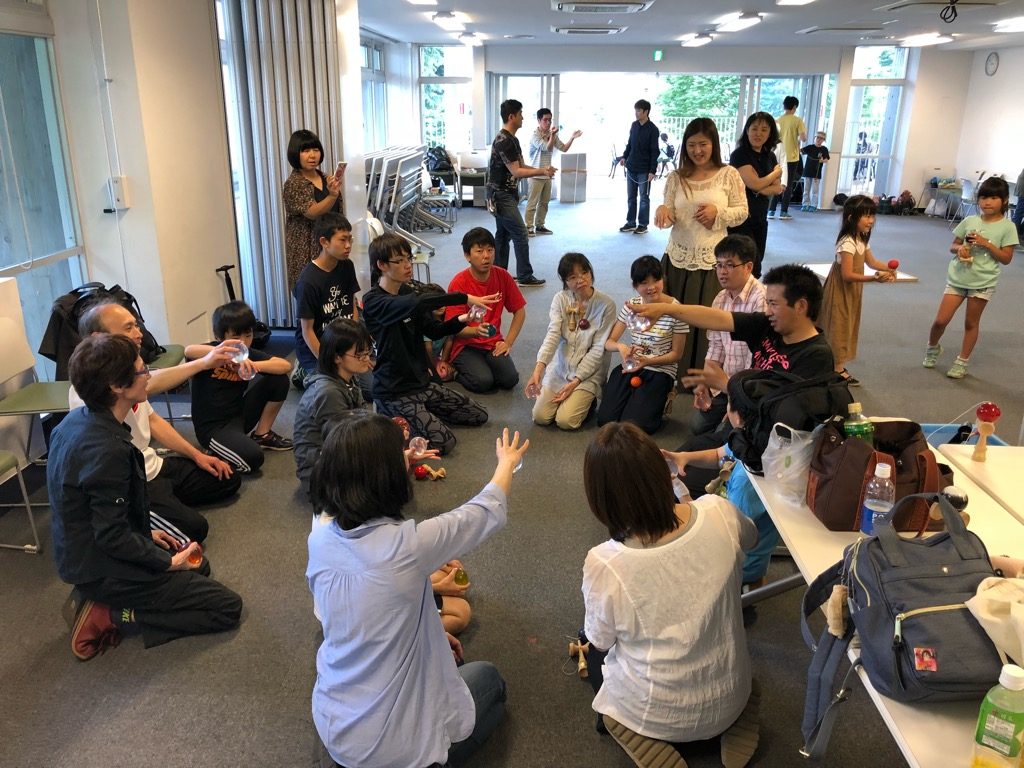 当日一緒にパフォーマンスをしたJARJAさんのコンタクトジャグリングワークショップ。けん玉の人たちに特に人気でした。