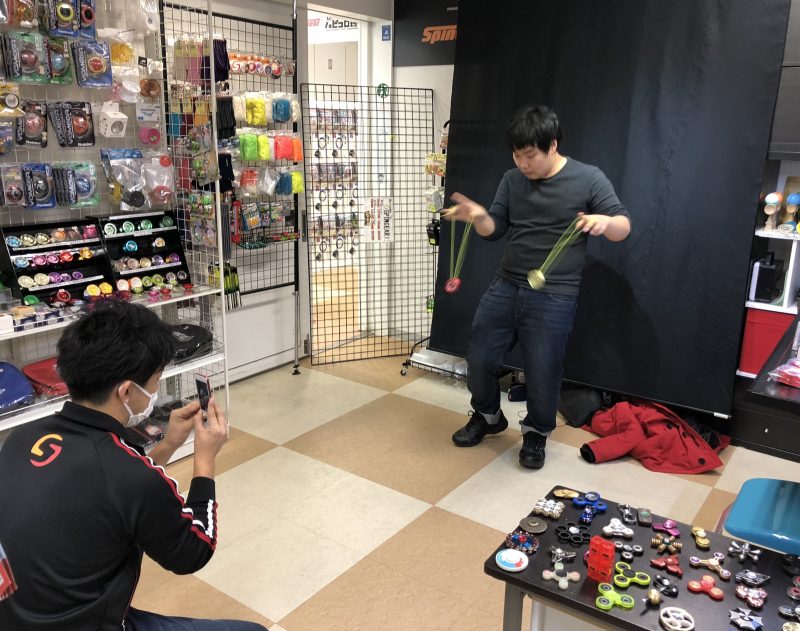 繁忙期(レジに絶え間なく人が並ぶ時間帯)を除く時間帯に、スピンギアのヨーヨースペースをトリック収録のためのスペースとして開放いたします。他のお客様との兼ね合いがあるので1度に1トリック、最大5分程度の撮影を目安にしていただければと思います。余裕があるときはスタッフと話し合いながら自由に使ってみてください。三脚はあるのでスマホを固定する方法をお持ちいただければセルフ収録も可能です。