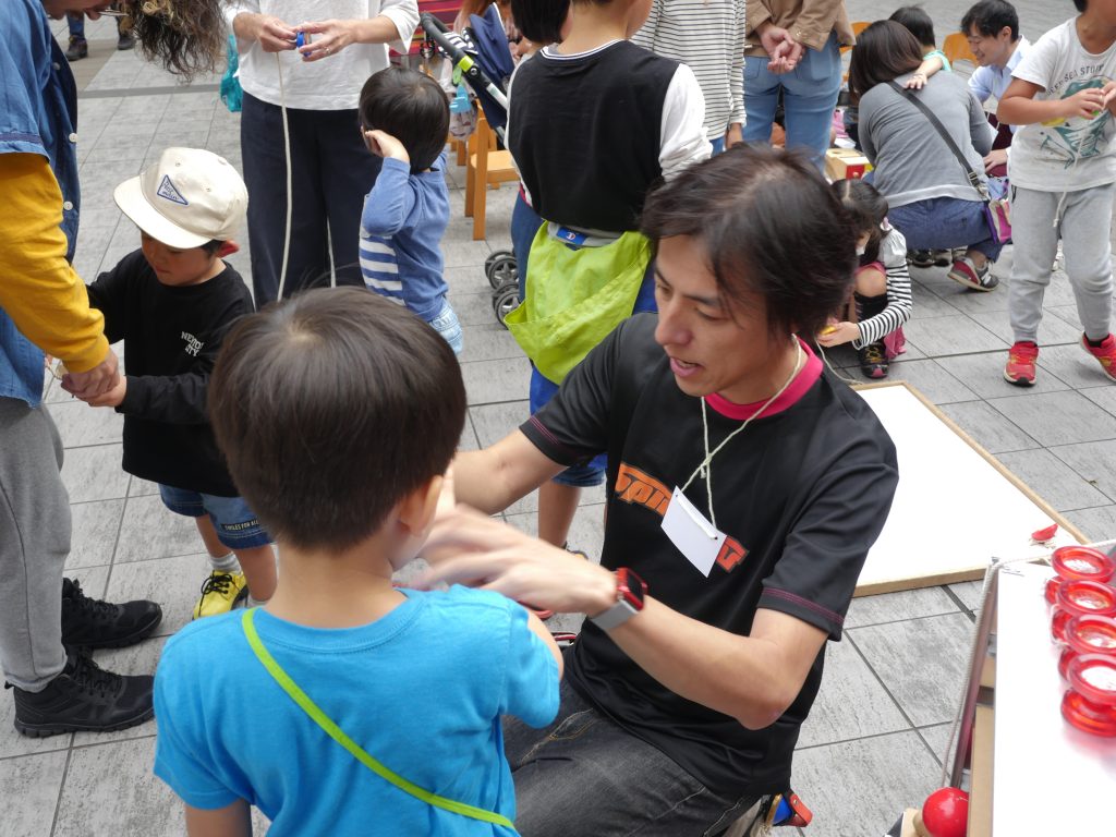 子供たちもとても元気で途切れること無くヨーヨー、けん玉、こまの体験をしていってもらいました。