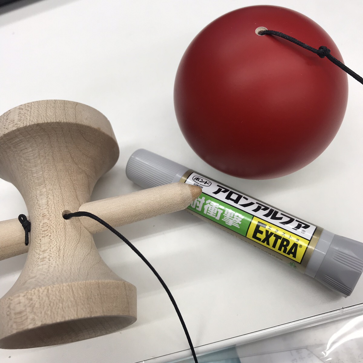 けん先は瞬間接着剤を塗って潰れにくくするのが好きです。最近はけん先が少し潰れていたほうがやりやすい技(ボーダーバランスなど)があったり、玉の塗装が傷みやすいという理由で瞬間接着剤を塗らない方が定番となっていますが、けん先が尖っていると刺すときの有効幅が相対的に広くなるので「ボーダーはこのけん玉ではやらない!」と決めたら瞬間接着剤を使うようにしています。