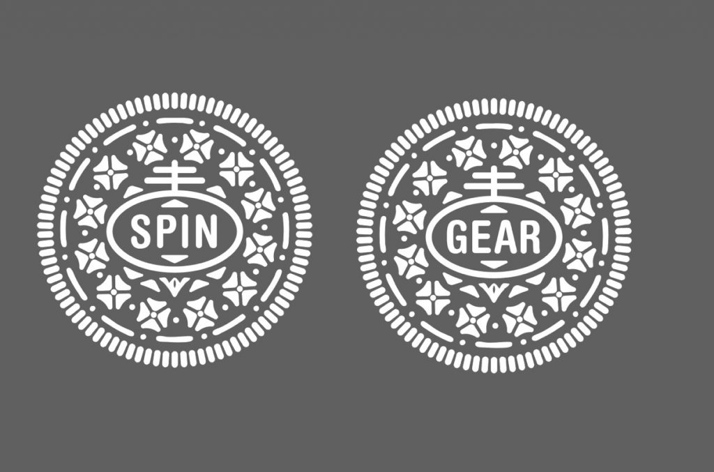 OREOの置き換えで安定する4文字のワードにして表と裏でSPINGEARにしてもらいました。フォントもオリジナルに寄せてもらいました。ロゴはトレースせずに似せるだけにしてあります。