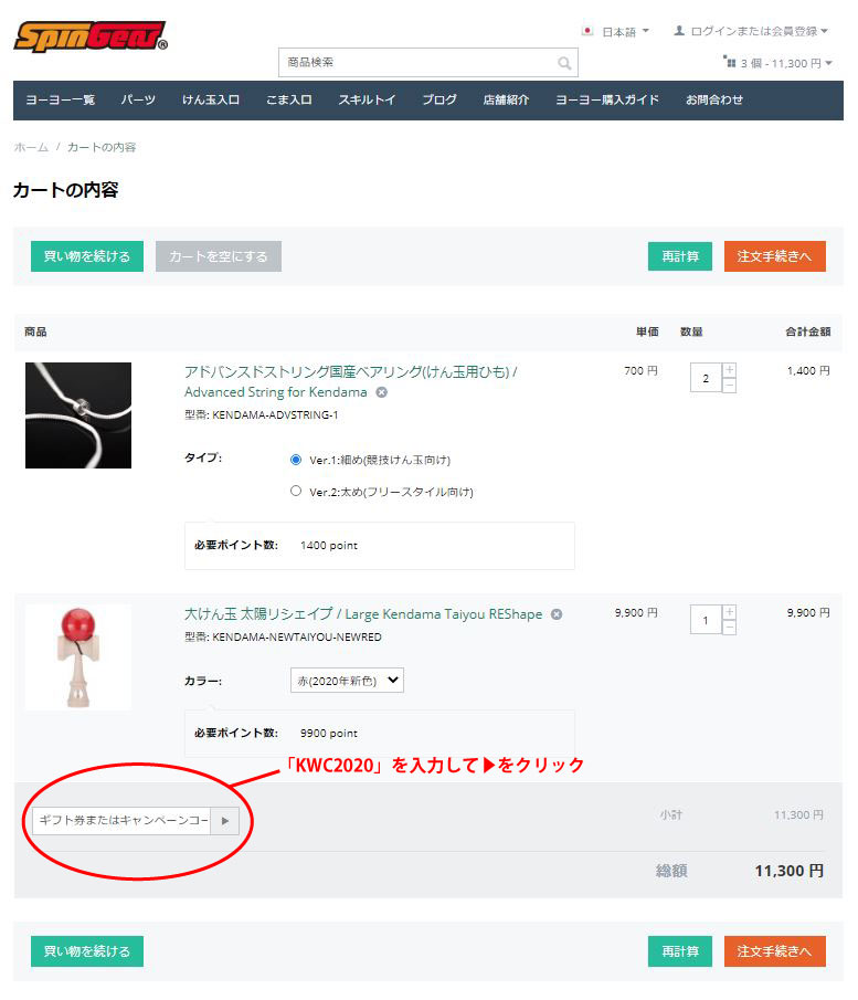 お買い物の際にこちらのクーポンコード「KWC2020」を入力していただくと、けん玉カテゴリの商品がぜーんぶ10%オフになります。