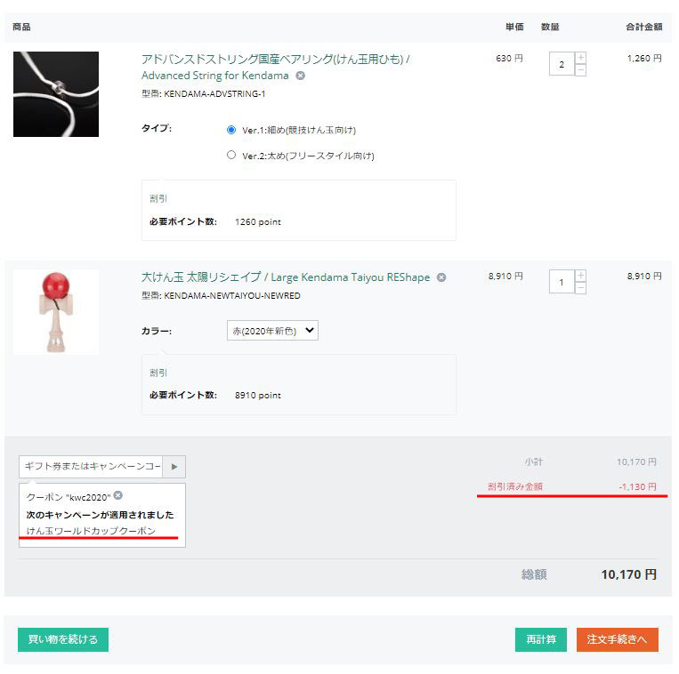 になっているので、大会前に消耗品や決戦用の新しいけん玉をお得にゲットするもよし、大会中に気になったモデルをあとからポチるもよし、KWCとは関係なしに前から欲しかったけん玉を買うもよしの便利なクーポンです♪