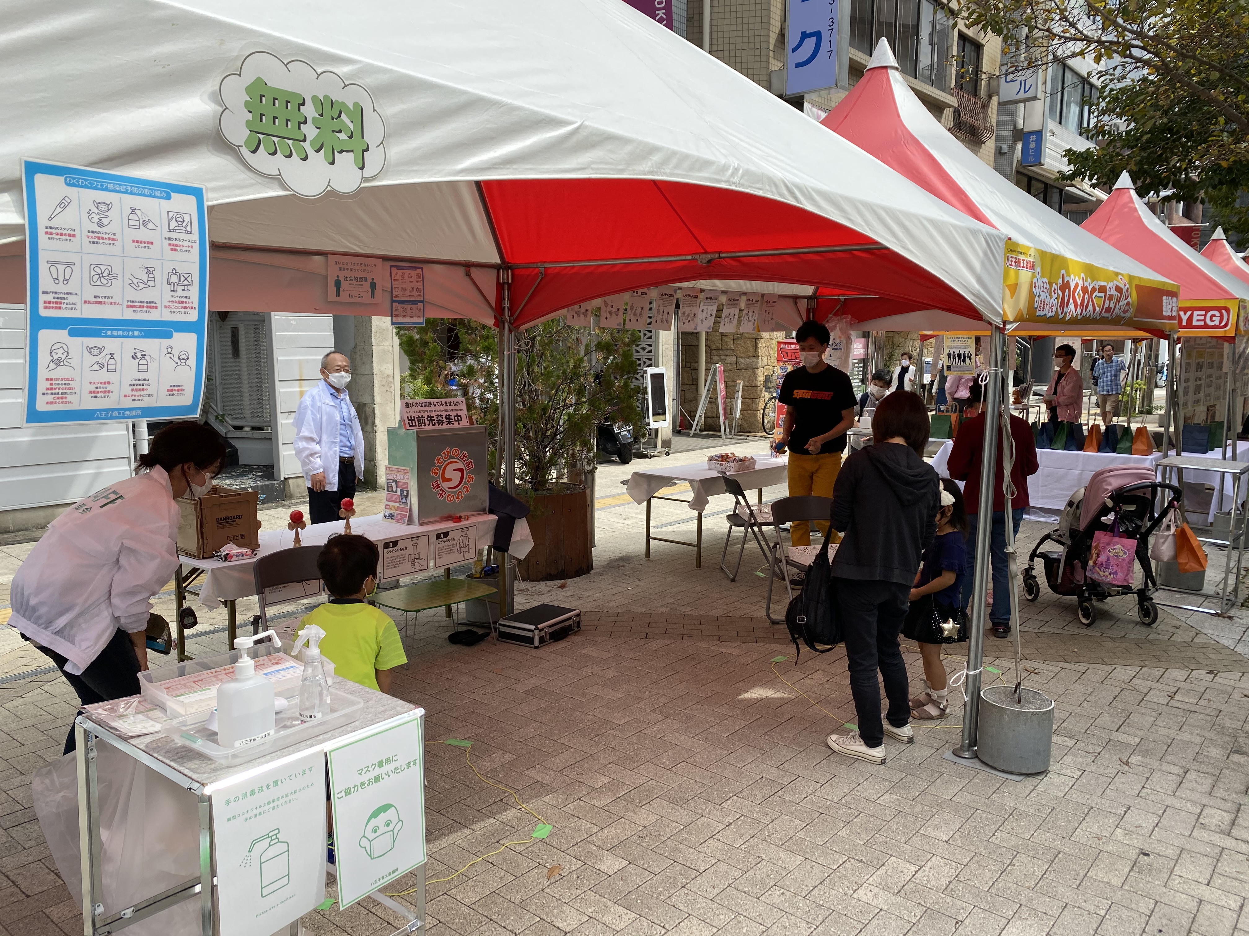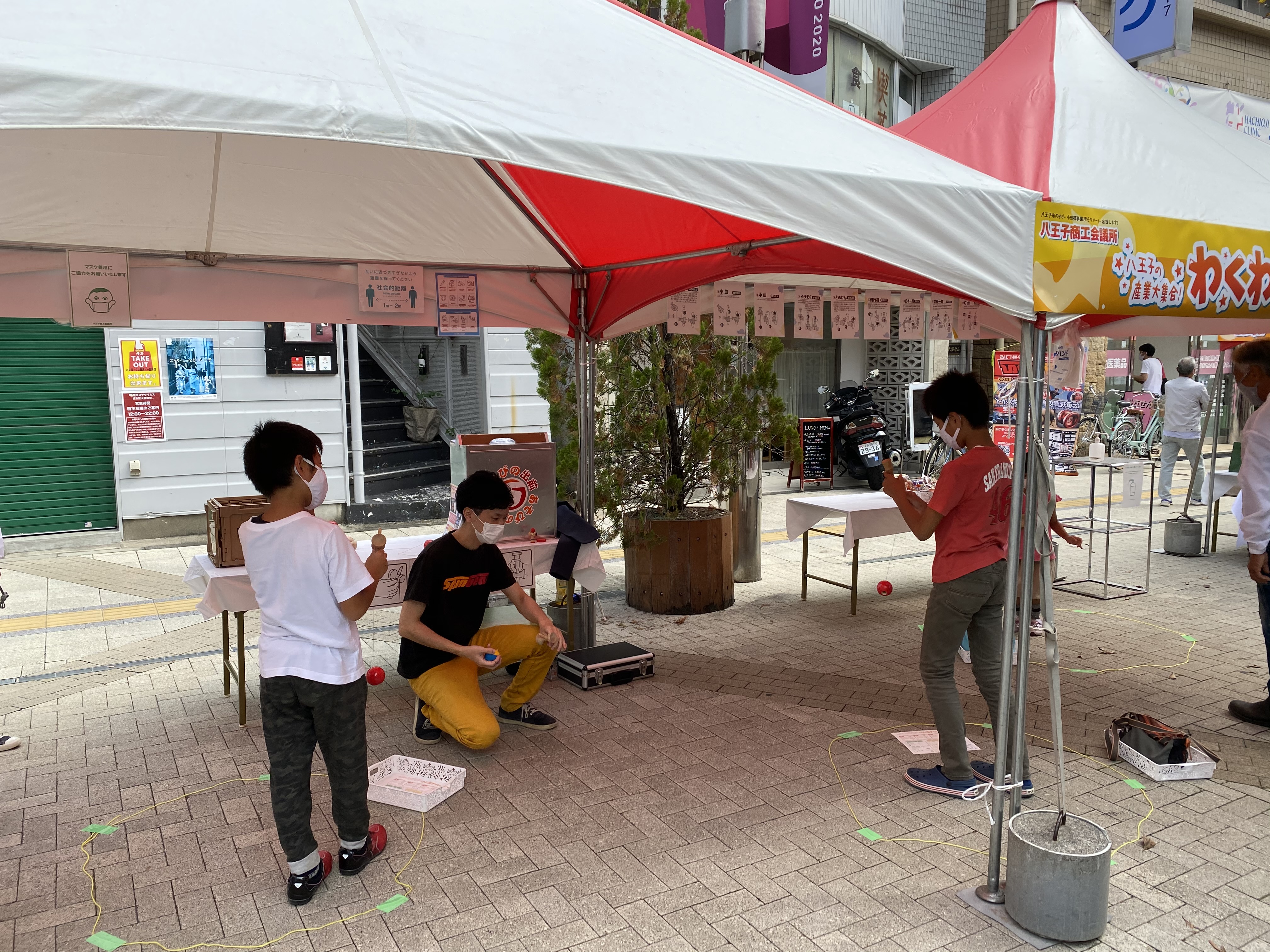 感染拡大防止のため、検温、ソーシャルディスタンス(黄色い円のエリアで遊んでもらう)、手指や道具の消毒、参加時間の上限設定など八王子商工会議所の方に様々な対策をしていただいた中での実施となりました。