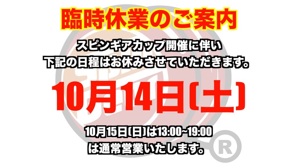 明日14日はスピンギアカップ開催に伴い、高円寺店は臨時休業となります。