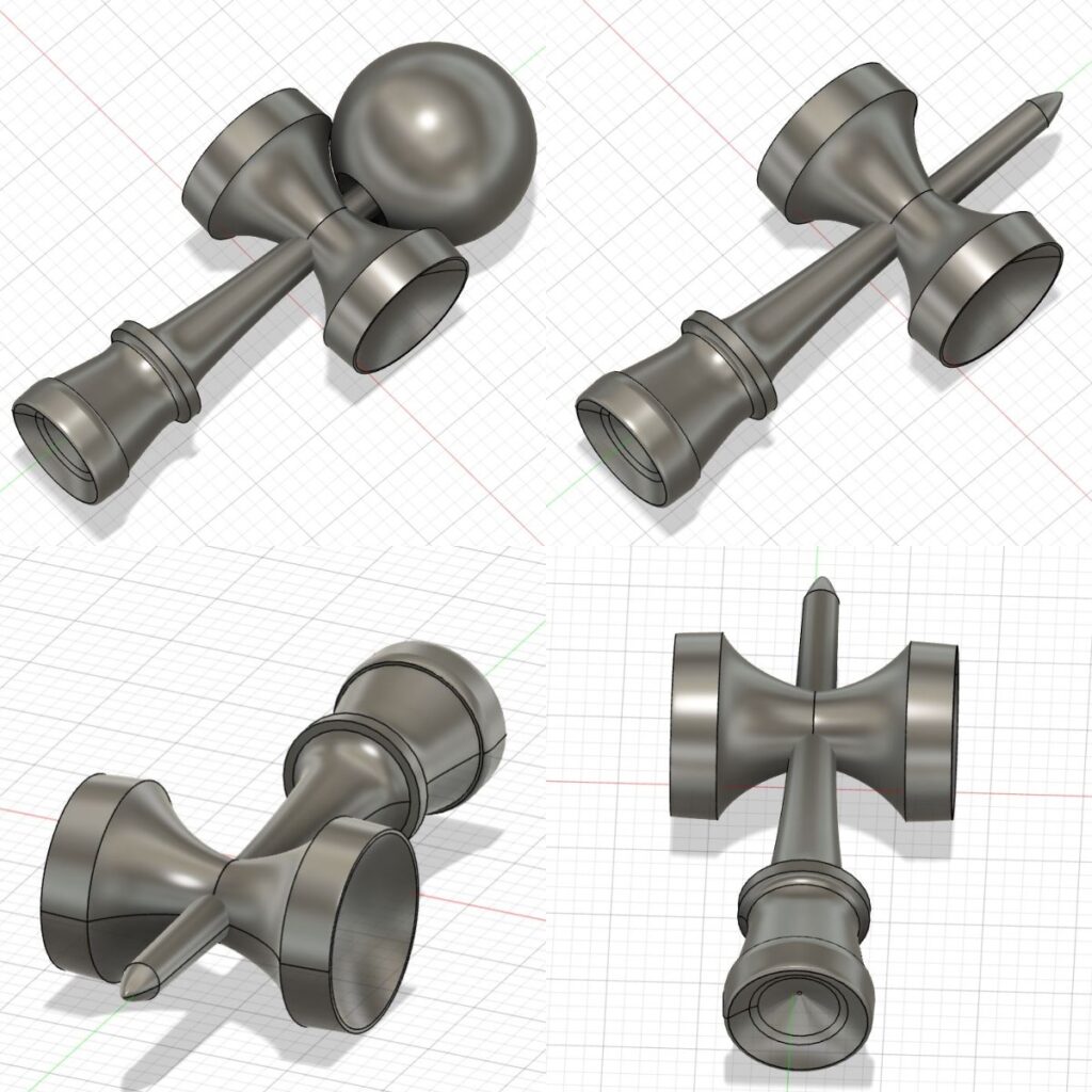 けん玉としての性能だけを考えるのであれば完全に水平(けんを立てたときに皿のふちが真横に伸びる形)にしてしまうのが正解な気もしますが、すごく特殊な見た目になってしまうので今回は見た目を損なわないギリギリの角度におさめています。(今のところ予定はないですが、いつか本気の性能特化形状も作ってみたいですね。)