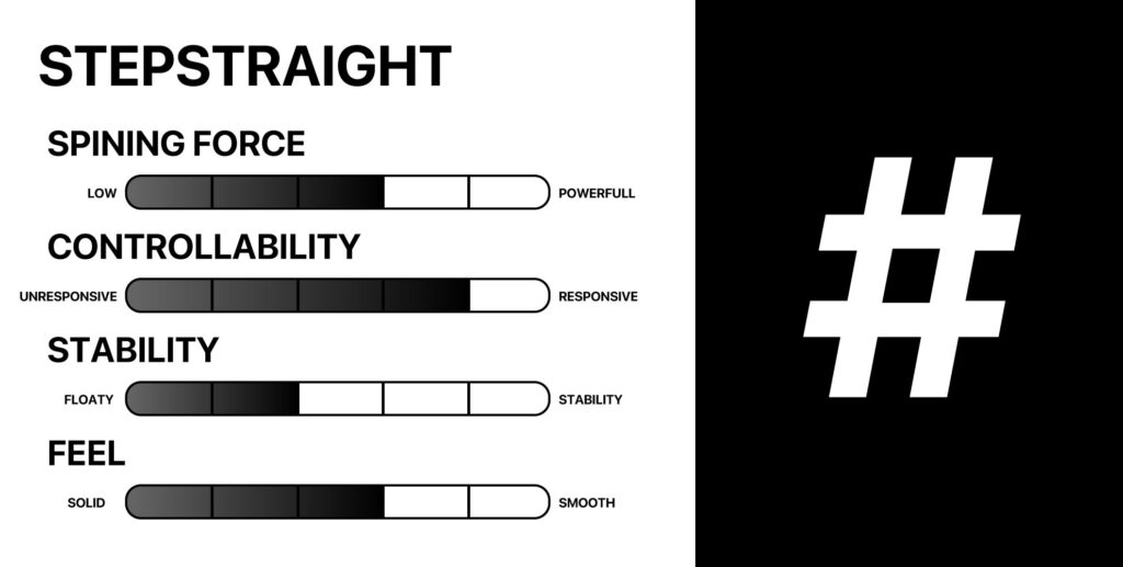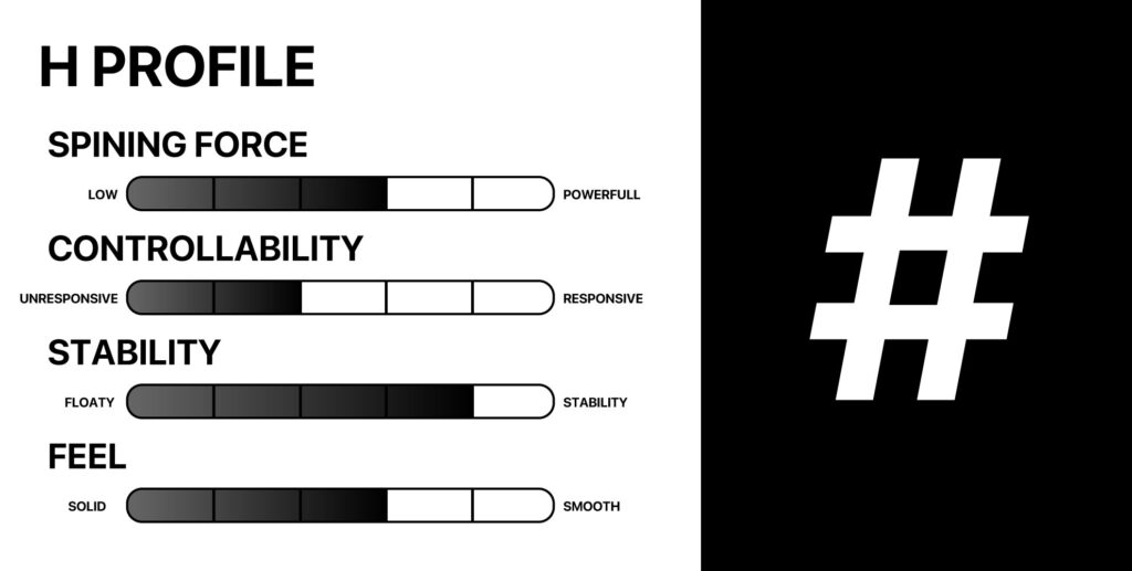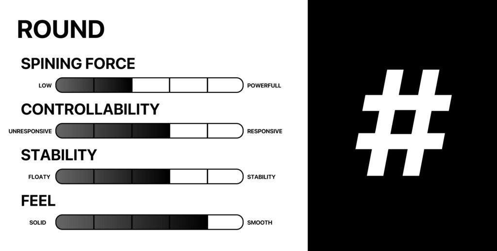 1. 回転力 (SPINING FORCE) 2. 動かしやすさ (CONTROLLABILITY) 3. 安定感 (STABILITY) 4. 感触 (FEEL)