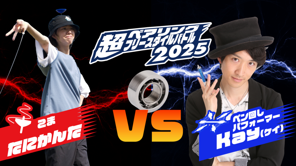 第二バトルはこま・たにかんた VS ペン回しパフォーマーKay。こまとペン回しの世界チャンピオン同士の対決は前代未聞。こまもペン回しもベアリングを余り使わない分野だけにどのようなベアリングと通常の道具の使い分けがあるのか楽しみ