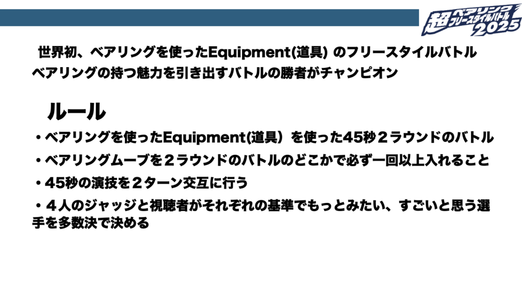 このバトル開催を機に、ベアリングが共通点というすでにバラバラには存在している道具を一つのカテゴリーに括って見直すことで新しい価値や今まで見過ごしていたものを再発見できるのではないだろうかという思いがあります。