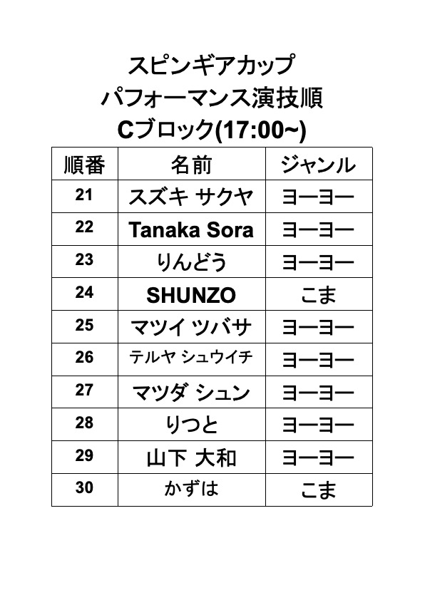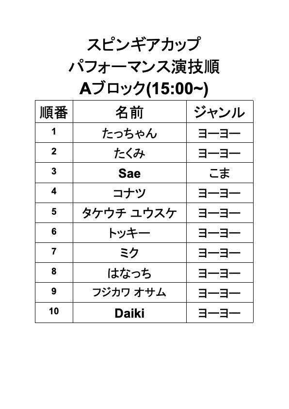 8. ・決勝14:00開始予定 (両部門キャッチありルールで行います) メインステージで開催 同時にロングスリーパーを行い、キャッチまでの時間を計測。 一番長く回したプレイヤーに1ポイント加算され、誰かが合計2ポイント獲得まで勝負が続けられます。 先に2ポイント獲得した人から各部門1〜3位を決定。 なお、キャッチミスは失敗と見なします(判定はジャッジ三村の判断に従ってください)