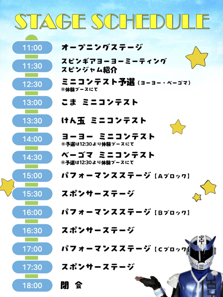 ・予選 (エントリー)12:30より開始 体験エリアで開催 ヨーヨー空転のタイムが長い上位5名が決勝進出です。 ※小学生以下部門はキャッチなし、一人2回までチャレンジOKです ※中学生以上部門はキャッチあり、一人1回のみのチャレンジです