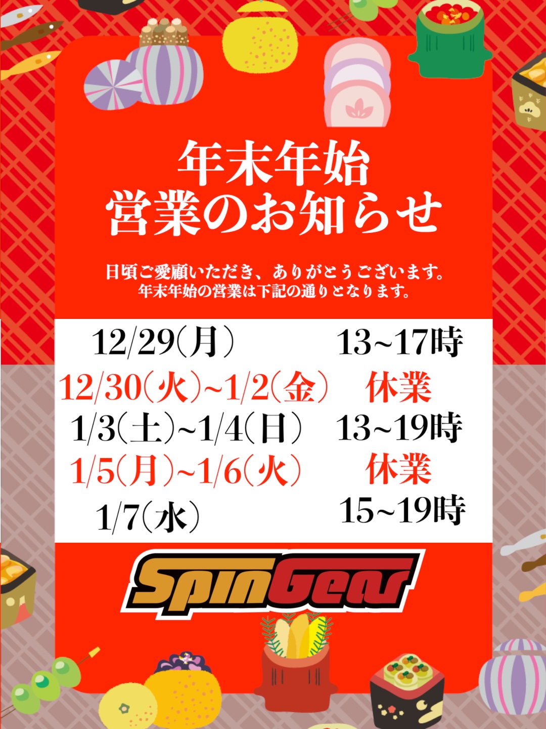 年内最後の営業は12月29日(月)短縮営業となります。