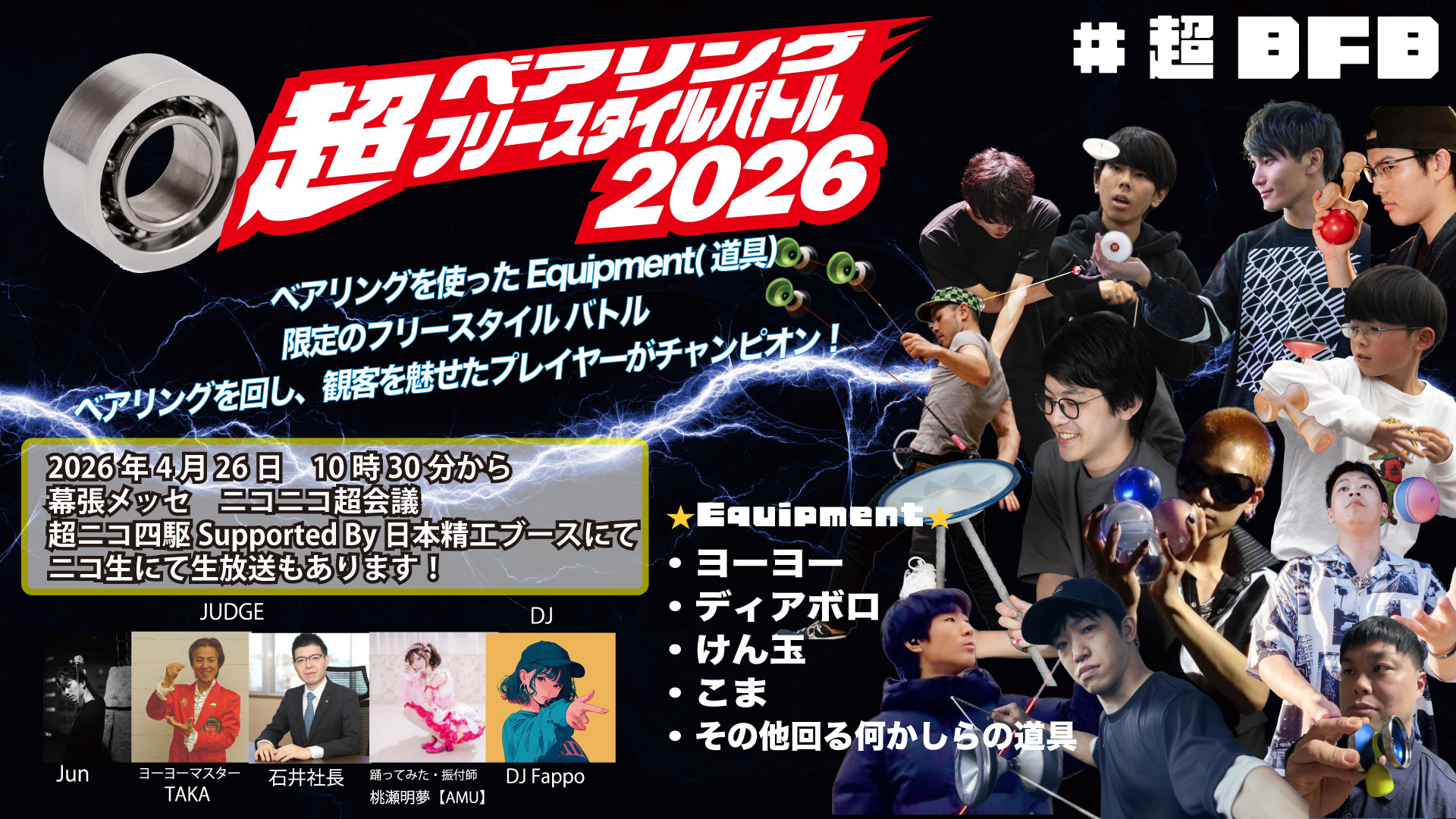 超ニコ四駆SupportedBy日本精工に、初年度からヨーヨーで関わらせていただく中で、ベアリングの会社が協賛しているイベントなのでベアリングが主役という企画があってもいいのではないだろうかという気持ちがありました。昨年、第一回目の取り組みとしては大成功と言える盛り上がりを見せ、日曜日の午前中という昇格も果たし2回目の開催となります。