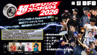 イベント告知 #超BFB 2026まとめページ 超BFB選手紹介!今回は12名の参加となり6名x2回のサイファー形式の予選かからトーナメント進出の4名を決定する方式となります。(昨年のまとめ記事もご覧ください) 1. ハヤト2017年IJA世界チャンピオン。ノウハウを詰め込み、監修をした... 2026.04.23 イベント告知